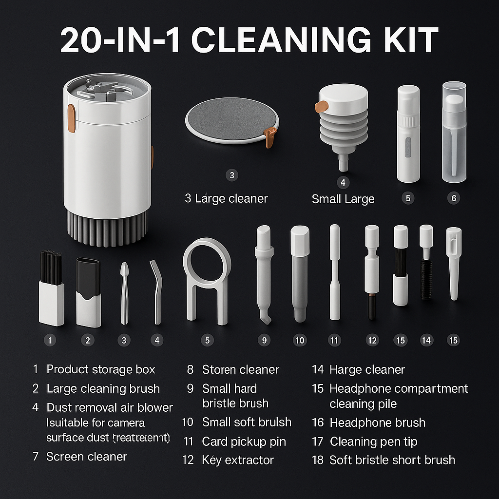Our kit comes with 20 essential tools like brushes, swabs, cloths, spray bottles, and more—specially designed for cleaning screens, lenses, keyboards, earbuds, and other delicate electronics.