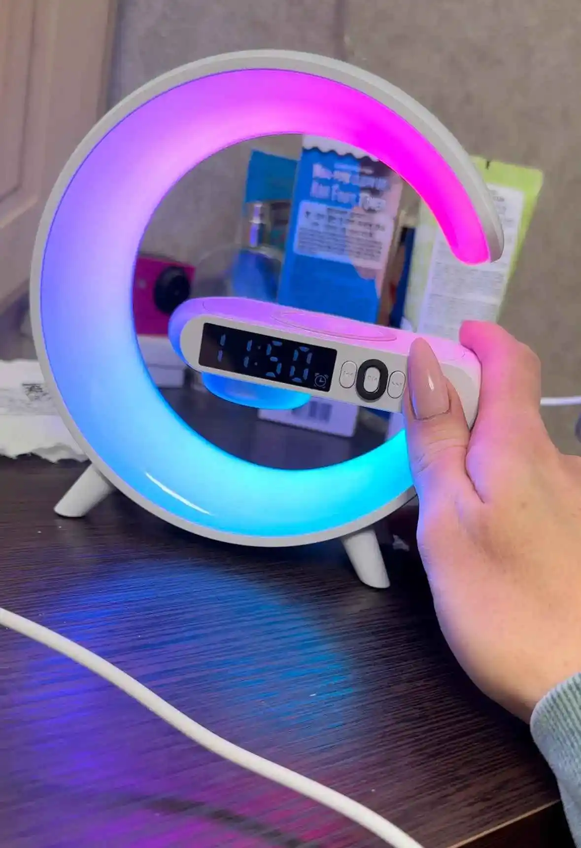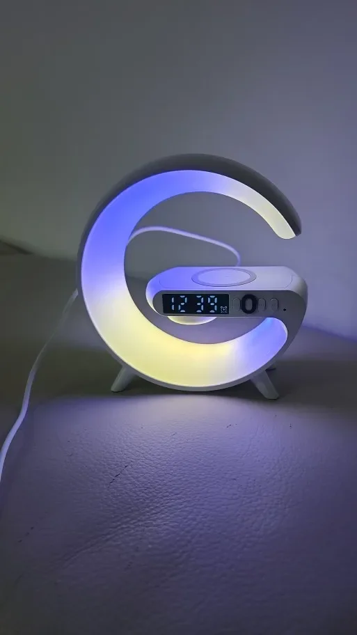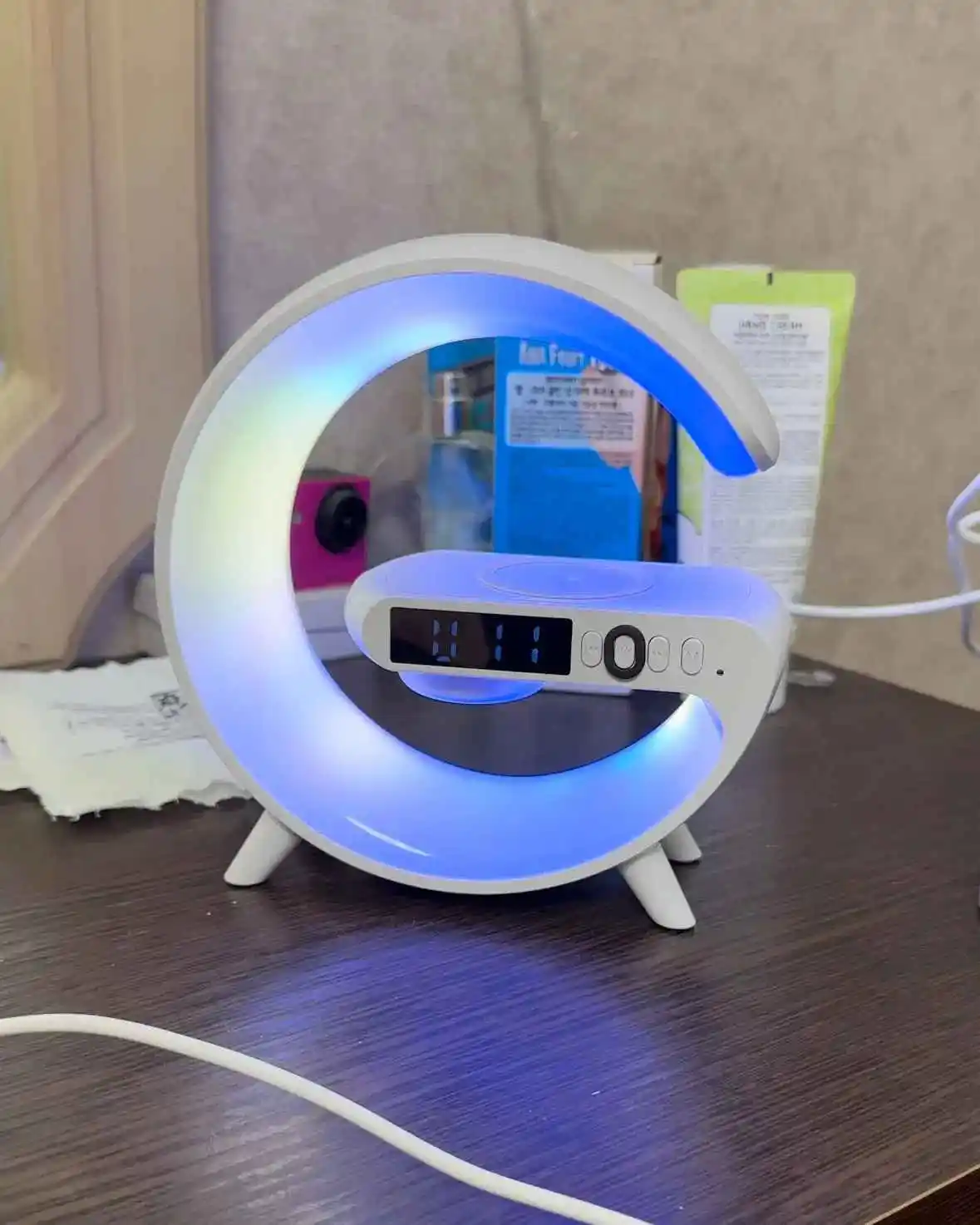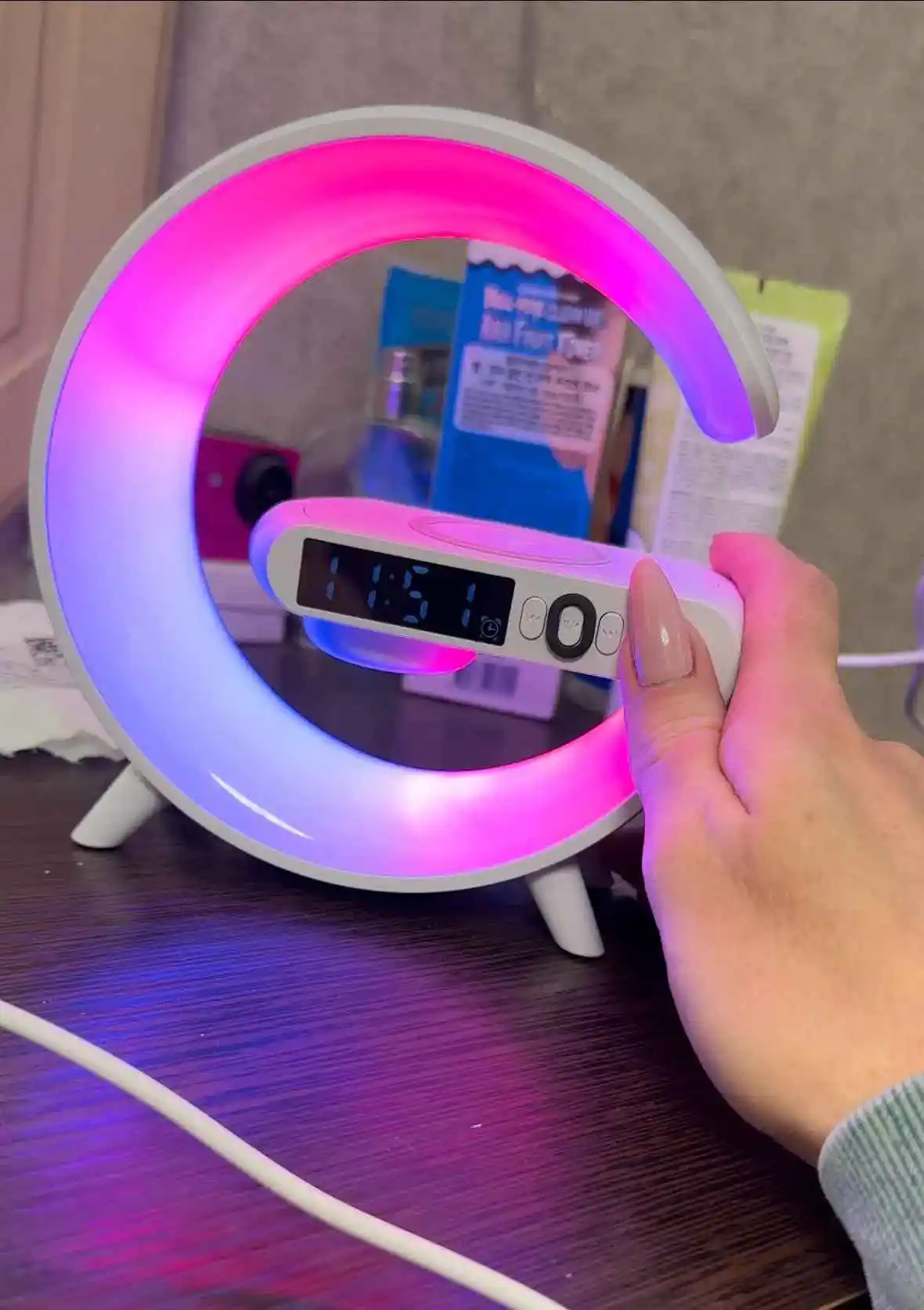 It’s a multifunctional device shaped like the letter “G” that works as a Qi‑compatible wireless charger, LED lamp, and a Bluetooth speaker with optional alarm clock features.