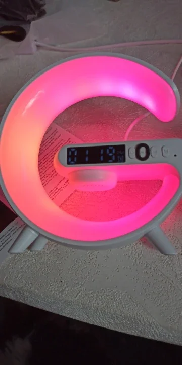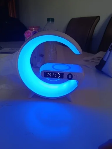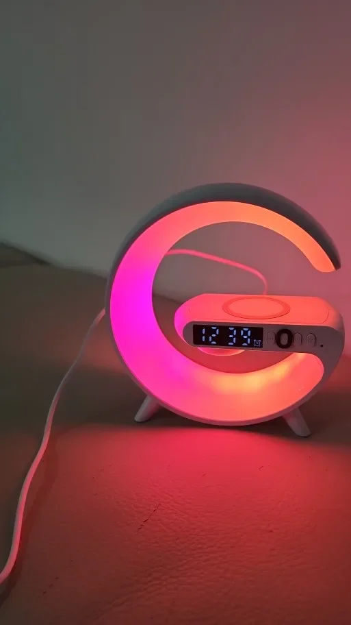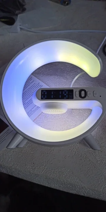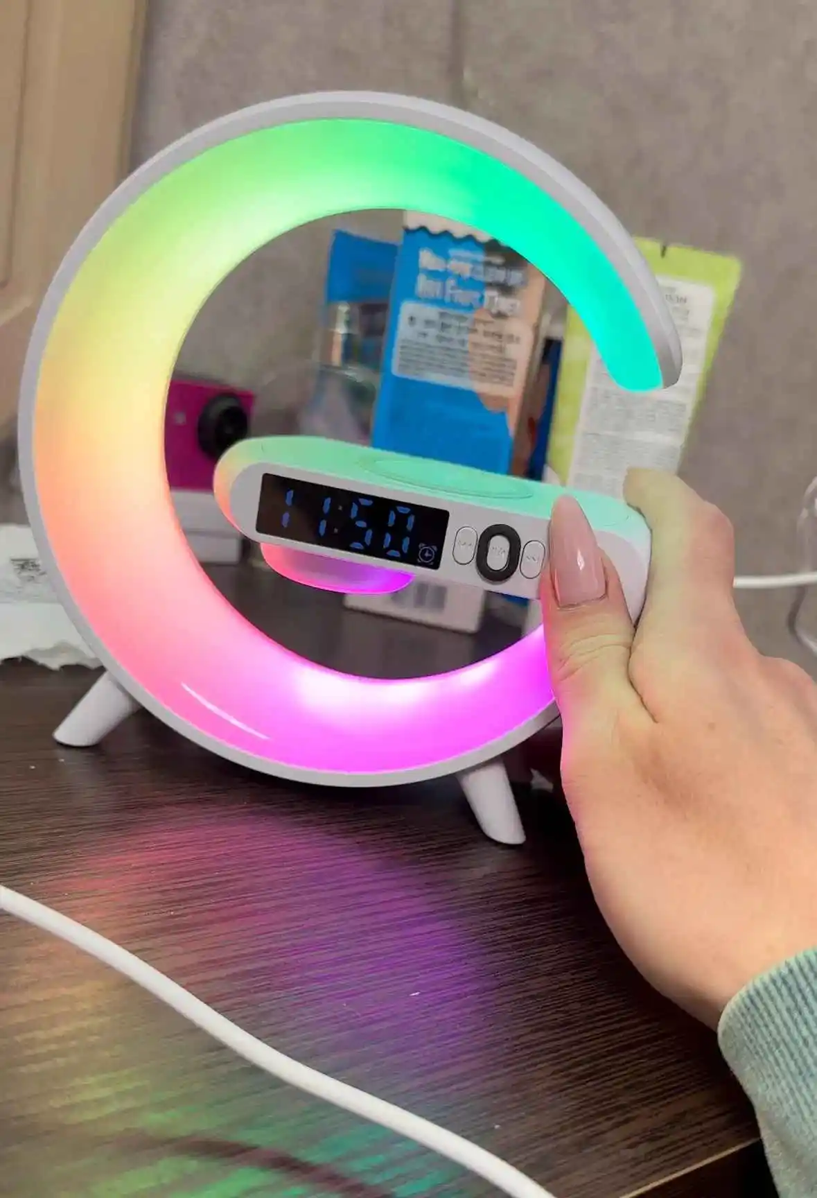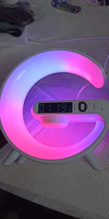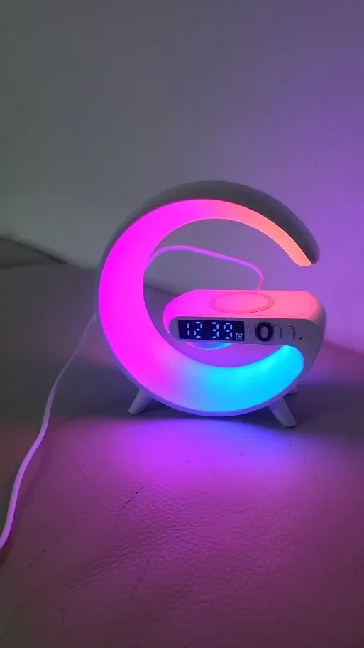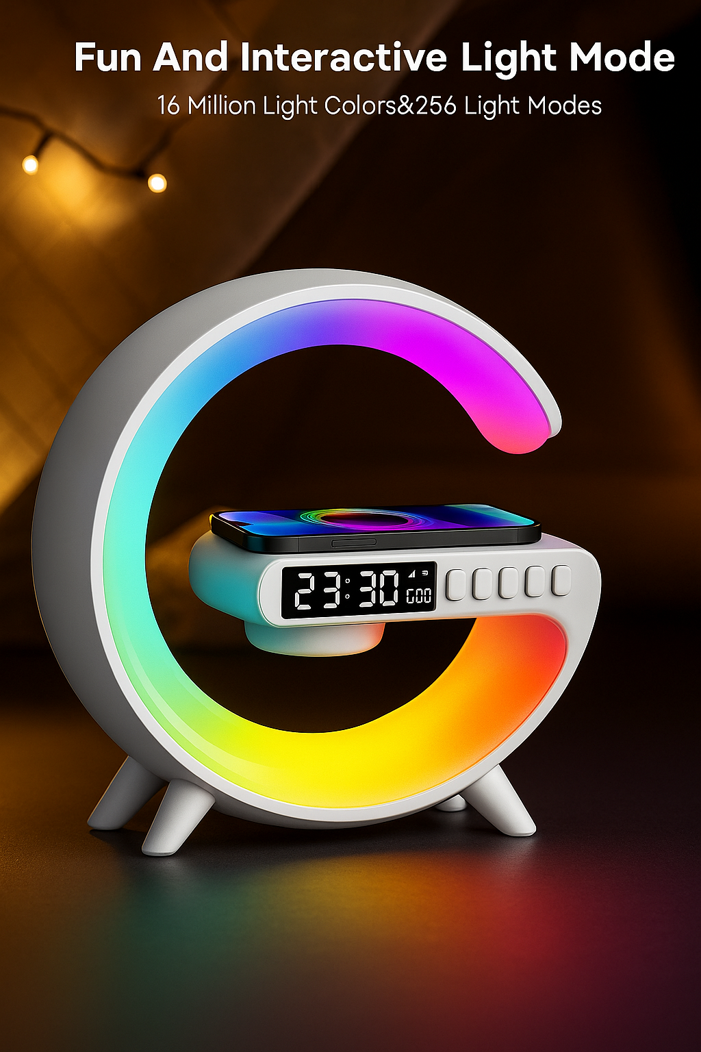 It’s a multifunctional device shaped like the letter “G” that works as a Qi‑compatible wireless charger, LED lamp, and a Bluetooth speaker with optional alarm clock features.