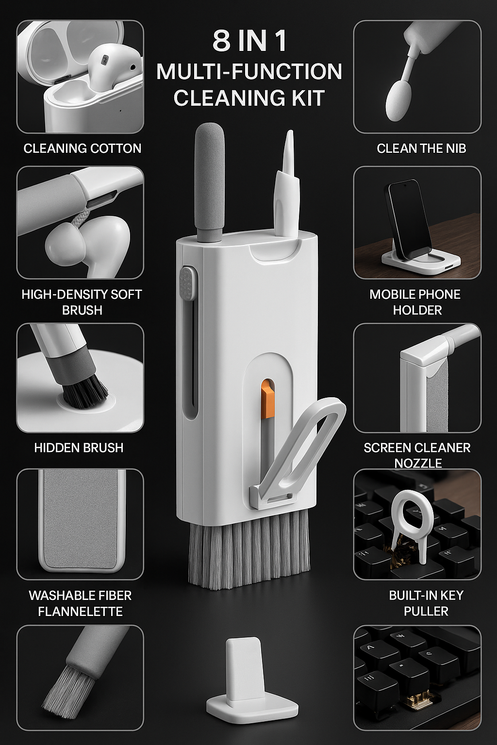 Make cleaning effortless with our 8-in-1 Cleaning Kit, designed to handle multiple tasks with a single, compact tool.