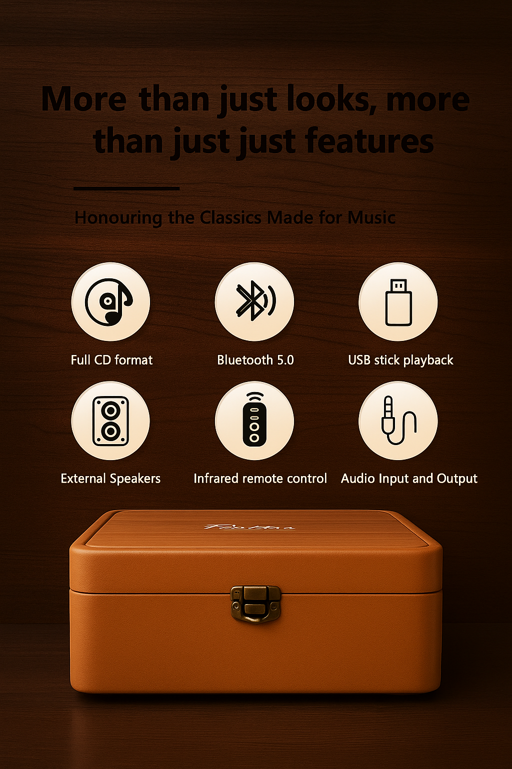 Enjoy timeless style and modern convenience with the Vintage Leather CD Player, delivering rich Hi-Fi sound whether spinning CDs, streaming via Bluetooth 5.0, or playing music from USB.